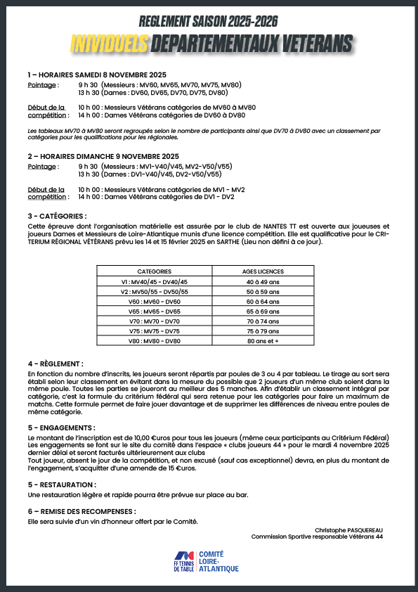 Règlement avec toutes les informations sur le site CDTT44 - Rubrique Sportif - Compétitions Vétérans - Critérium Départemental Vétérans