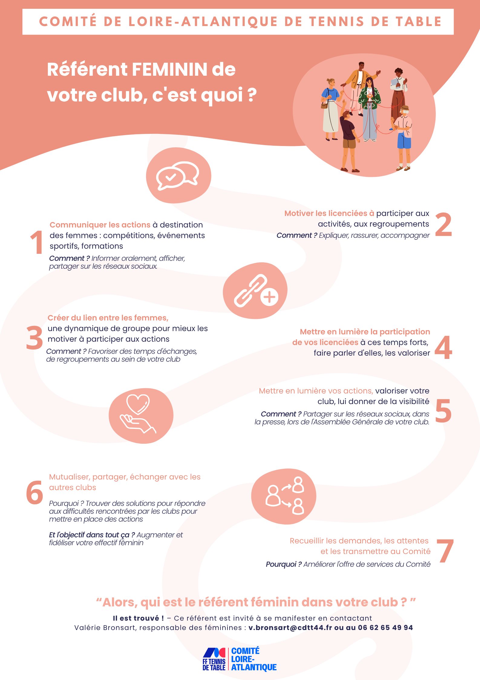 En cas de difficultés pour vous inscrire, contactez le référent féminin de votre club ou au Comité, Valérie Bronsart : v.bronsart@cdtt44.fr – 06 62 65 49 94.